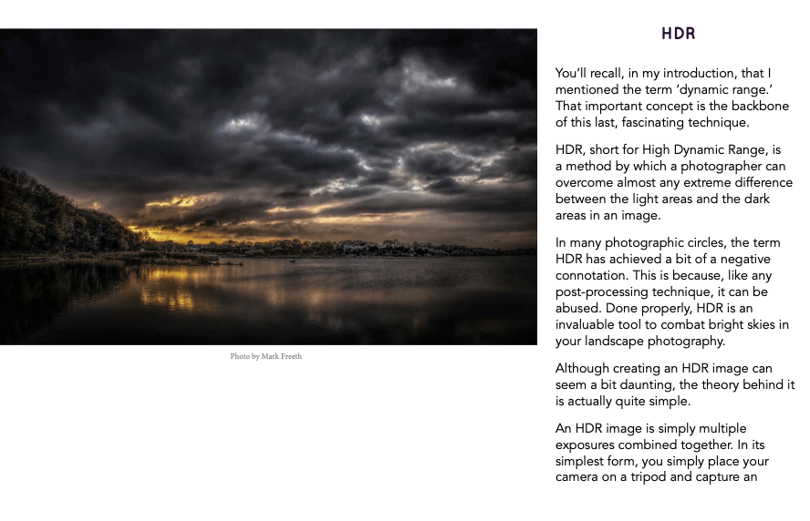 This photo lesson also described the benefits of HDR photos. In class we talked about HDR photos and how it combines multiple levels of exposure to obtain the truest image. This lesson talked about how HDR can combat bright skies. I liked the picture example in this lesson because it filters out where the picture would be too bright and just focuses on the color peaking through the clouds. Without an HDR filter I can assume that these colors would be extremely faint and not stand out as much as they do with the filter applies.