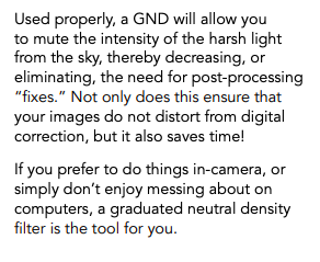I found a few lenses on amazon. The ones with a gradient effect seemed the most interesting to me because they can filter out the sun’s intensity at the top while still allowing the picture to be unfiltered at the bottom, however these types of lenses didn’t get as good as a review when compared to just a single density filter.